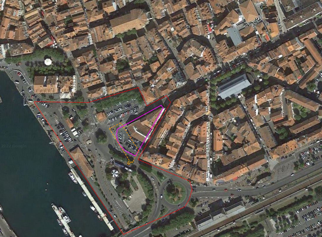 L'ilot Foch (rouge), le projet d'immeuble (rose) et le projet de parking souterrain (orange)L'« îlot Foch » (rouge), le projet d'immeuble (rose) et le projet de parking souterrain (orange) © Google (image)
