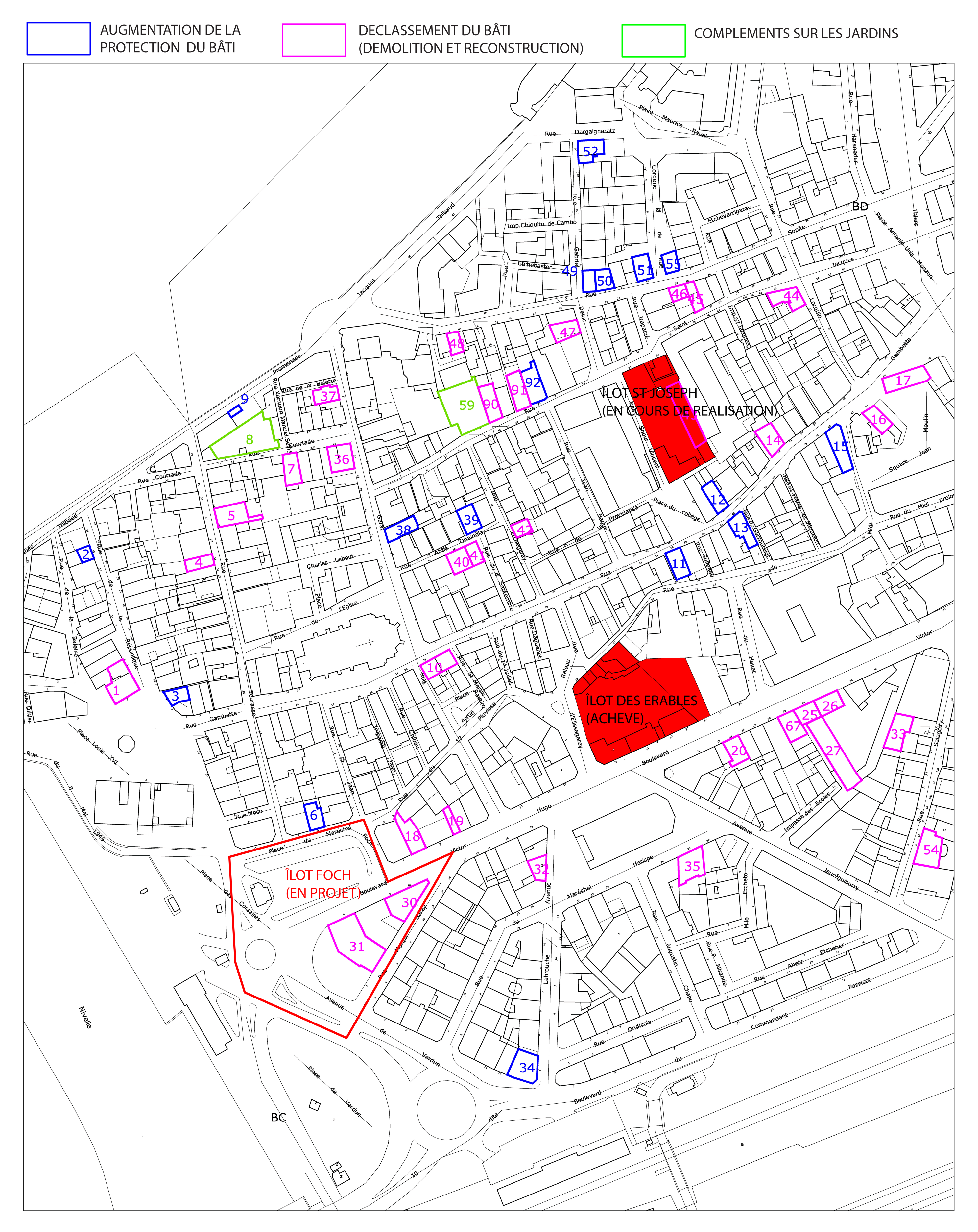 Dans l’AVAP, un déclassement ne peut légalement être effectué sans l’existence publique d’un « projet d’ensemble » préalablement validé par les services du maire, ici Peyuco Duhart. Les déclassements présents sur le plan (dont l’association GARDENA a soulevé que certains, prématurés en l’absence de projet urbain, n’étaient pas réglementaires –recours gracieux à consulter dans la rubrique actualités-) pourraient donc faire l’objet d’un projet de démolition/reconstruction. La vigilance s’impose!